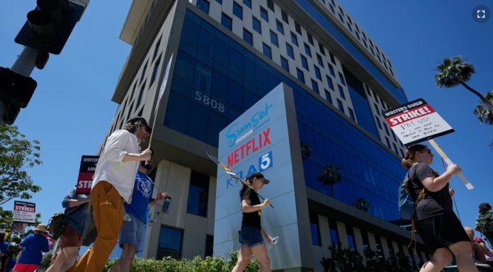 Afuera de las oficinas de Netflix en Hollywood, los guionistas en piquetes gritaron “¡Paguen a sus actores!” inmediatamente después de declarada la huelga. Los actores comenzarán a hacer piquetes junto con los escritores frente a las oficinas centrales de los estudios en Nueva York y Los Ángeles el viernes.