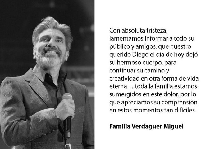 “Desafortunadamente la tarde de hoy, jueves 27 de enero, el maestro Diego Verdaguer falleció en la ciudad de Los Ángeles, California, por consecuencia del COVID-19. Desde el mes de diciembre le fue detectado el virus y fue hospitalizado”, señaló la casa discográfica.