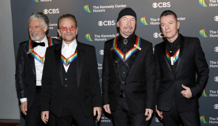El último homenajeado de la noche fue U2. En un video grabado el sábado, el guitarrista de U2, The Edge, señaló que un grupo de cuatro “muchachos irlandeses” estaban siendo honrados por sus contribuciones a la cultura estadounidense y dijo que existe un vínculo entre el grupo y Estados Unidos que realmente no se puede explicar.