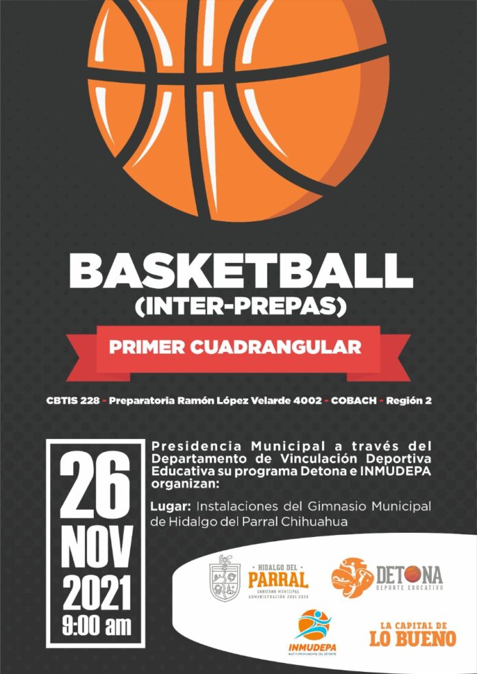 Parral, Chih .- La Presidencia Municipal de Parral a través del programa DETONA e INMUDEPA te invita a no perderte este viernes 26 de noviembre el primer cuadrangular de Basketball Inter-prepas donde participarán el CBTIS 228, la Prepa Ramón López Velarde, el COBACH y la escuela Gallos Región 2.