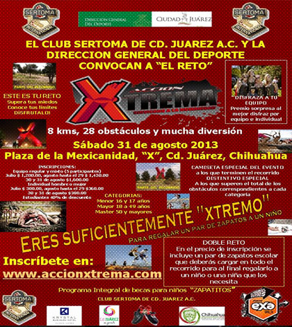 El Club Sertoma y la Dirección General del Deporte invitan a la comunidad deportista y a la comunidad en general a su evento:”ACCION XTREMA”, evento fundación para el programa integral de becas para niños de primaria “ZAPATITOS”, bajo las siguientes bases: