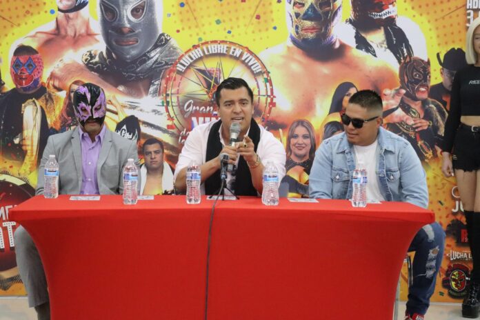Ciudad Juárez, Chih .- Los luchadores Magno, Steven Juárez y Aéreo, participaron en una conferencia de prensa para presentar la cartelera, la cual formará parte de la gira del retiro del Hijo del Santo.
