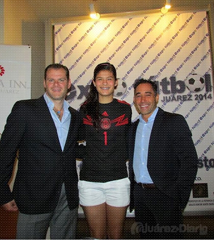 La guardameta de la Selección Mexicana, en la pasada Copa Mundial Sub-17, Emily Alvarado, el comentarista deportivo Miguel Gurwitz y el conductor televisivo Juan José Ulloa, en compañía del comité organizador, presentaron y confirmaron la realización en esta ciudad de la Expo Fútbol ‘Juárez 2014’.