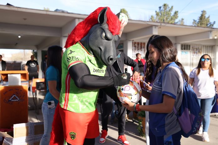 Ciudad Juárez, Chih .- “Queremos infancias y adolescencias felices, en las que la educación y el deporte sean parte de su vida, por eso esta estrategia conjunta entre el equipo de futbol Bravos y DIF, en la que recorremos escuelas llevando un mensaje que inspire a niñas, niños y adolescentes a cumplir sus sueños. Esta es la primera secundaria de la agenda y estamos muy agradecidos por el recibimiento y participación del estudiantado y sus maestros”, dijo la titular del DIF.