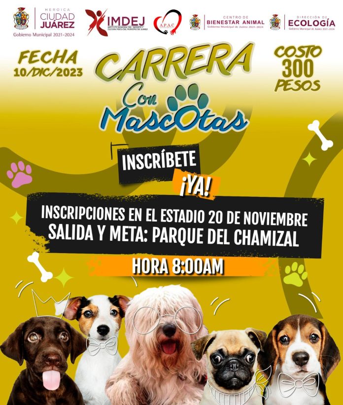 Por una iniciativa encabezada por la regidora Alma Arredondo y en colaboración con la Dirección de Ecología y el Instituto Municipal del Deporte y Cultura Física, el próximo 10 de diciembre, a las 8:00 de la mañana, se llevará a cabo la Primera Carrera con Mascotas, competencia que tendrá como escenario el parque El Chamizal.