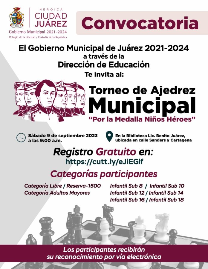 El Gobierno Municipal, a través de la Dirección de Educación, invita a la ciudadanía a participar en el Cuarto Torneo de Ajedrez 2023 “Por la Medalla Niños Héroes” que se llevará a cabo el próximo sábado 9 de septiembre.