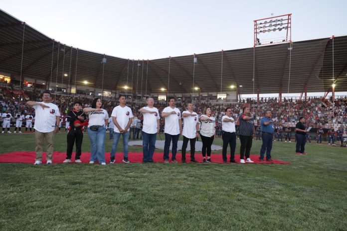 El Presidente Municipal, Cruz Pérez Cuéllar, lanzó la primera pelota en el juego en el que los Indios de Juárez recibieron a los Mineros de Parral en el arranque de la Temporada 2023 de la Liga Estatal de Béisbol (LBE).