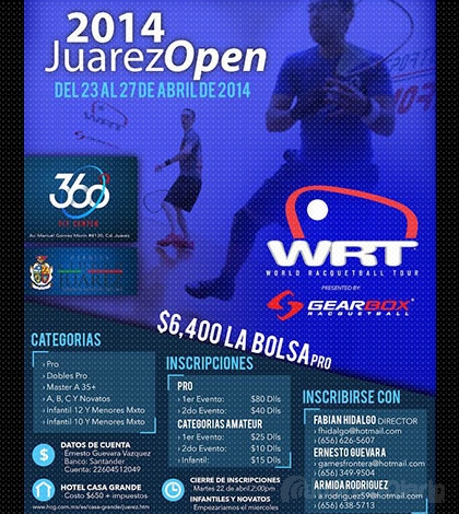Mañana viernes por medio de una comida informativa-conferencia de prensa, se presentará de manera oficial, el Torneo de Raquetbol ‘Juárez Open-WRT Tour Mexicano 2014’, como parte del Tour Mundial de Raquetbol, por sus siglas en inglés (WRT) que realiza en México, a verificarse este fin de semana en las canchas del Gimnasio 360⁰ Fit Center de la ciudad.