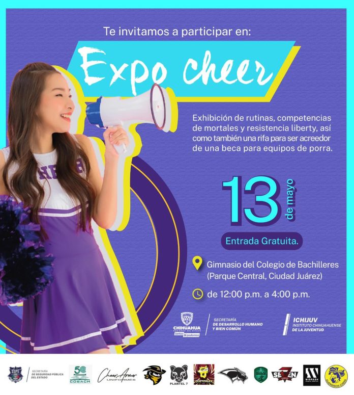 Ciudad Juárez, Chih .- Con el fin de fomentar el deporte y brindar espacios de sana recreación el Gobierno del Estado, a través del Instituto Chihuahuense de la Juventud (ICHIJUV) y la Secretaría de Seguridad Pública del Estado (SSPE), invita a las y los jóvenes chihuahuenses a participar en el concurso de exhibición y competencia de porra “Expo Cheer” en Ciudad Juárez.