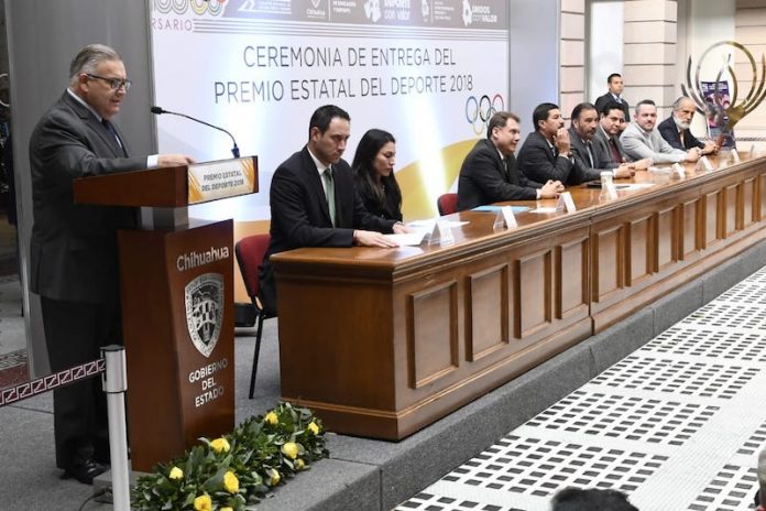 Chihuahua, Chih. – La deportista Quisia Yaneli Güicho Recio, de halterofilia, y el entrenador Ernesto Aarón Palomino González, de rácquetbol, recibieron el Premio Estatal del Deporte en su edición XXVII, de manos del gobernador Javier Corral.