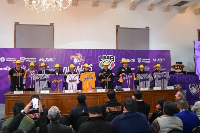 Chihuahua, Chih .- La gobernadora Maru Campos presidió en el Palacio de Gobierno, la ceremonia en que fue presentado oficialmente el equipo Dorados de Chihuahua, como nuevo integrante de la Liga Mexicana de Beisbol (LMB), certamen al que regresa luego de 14 años de ausencia.