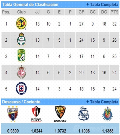 General. En la Tabla General, América es el líder con 32 unidades, lo sigue Santos Laguna con 26 puntos. En el fondo están Atlas y Chivas con 8 unidades.