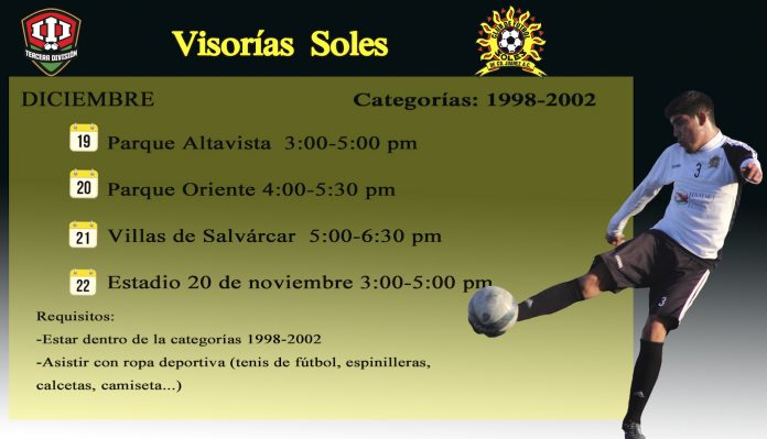 Ciudad Juárez, Chih. – Hoy, martes 19 de diciembre, dan inicio las visorías en el equipo de Soles, en las instalaciones del parque Altavista en punto de las 3 de la tarde con una duración de dos horas.