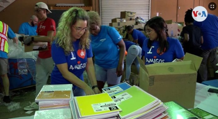 Miami, Florida (VOA) – Carolina Ozuna es una venezolana que lleva toda la mañana cargando cajas con material escolar en un almacén prestado del sur de la Florida. Acaban de llegar tres camiones cargados con material escolar para las familias más necesitadas de Miami y ella es una de las voluntarias encargadas de separar los productos para llenar mochilas con enseres escolares.
