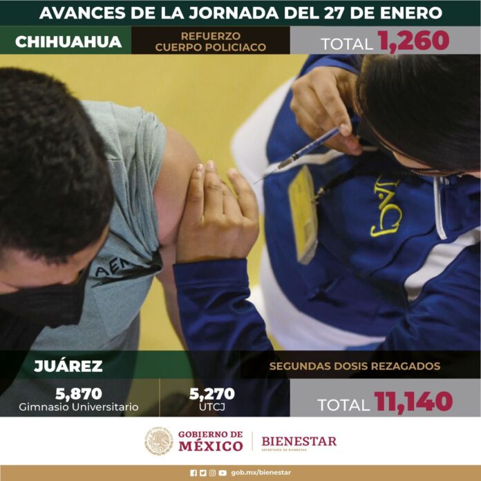 Ciudad Juárez, Chih. (ADN / Martín Orquiz) – Durante el primer día de la jornada para aplicar segunda dosis a rezagados mayores de 18 años, se logró inyectar a 11 mil 140 personas de 35 años y más, reportó personal de la Secretaría de Bienestar.