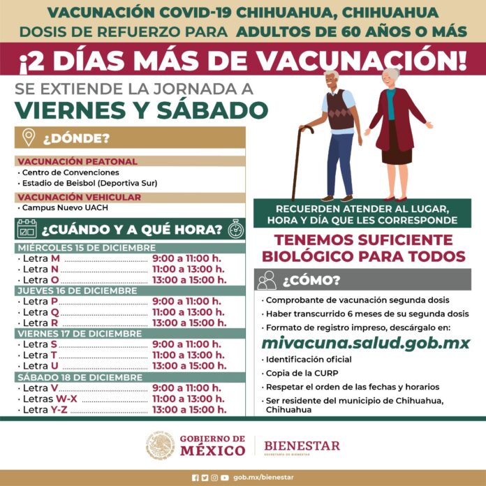 Chihuahua, Chih. (ADN / Martín Orquiz) – Autoridades de la Secretaría de Bienestar decidieron extender hasta el sábado 18 de diciembre la jornada de vacunación de la tercera dosis como refuerzo en la ciudad de Chihuahua, anunció el delegado de los Programas para el Desarrollo, Juan Carlos Loera de la Rosa, para personas de 60 años y más.