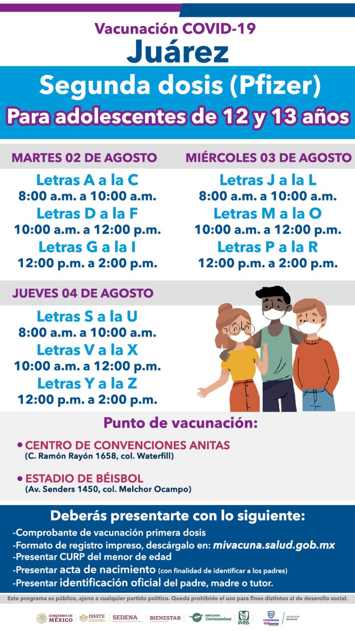 La Secretaría de Salud en coordinación con las instituciones encargadas de la vacunación contra COVID-19, informa que del 2 al 4 de agosto se aplica la segunda dosis del biológico de Pfizer, para adolescentes de 12 y 13 años de edad.