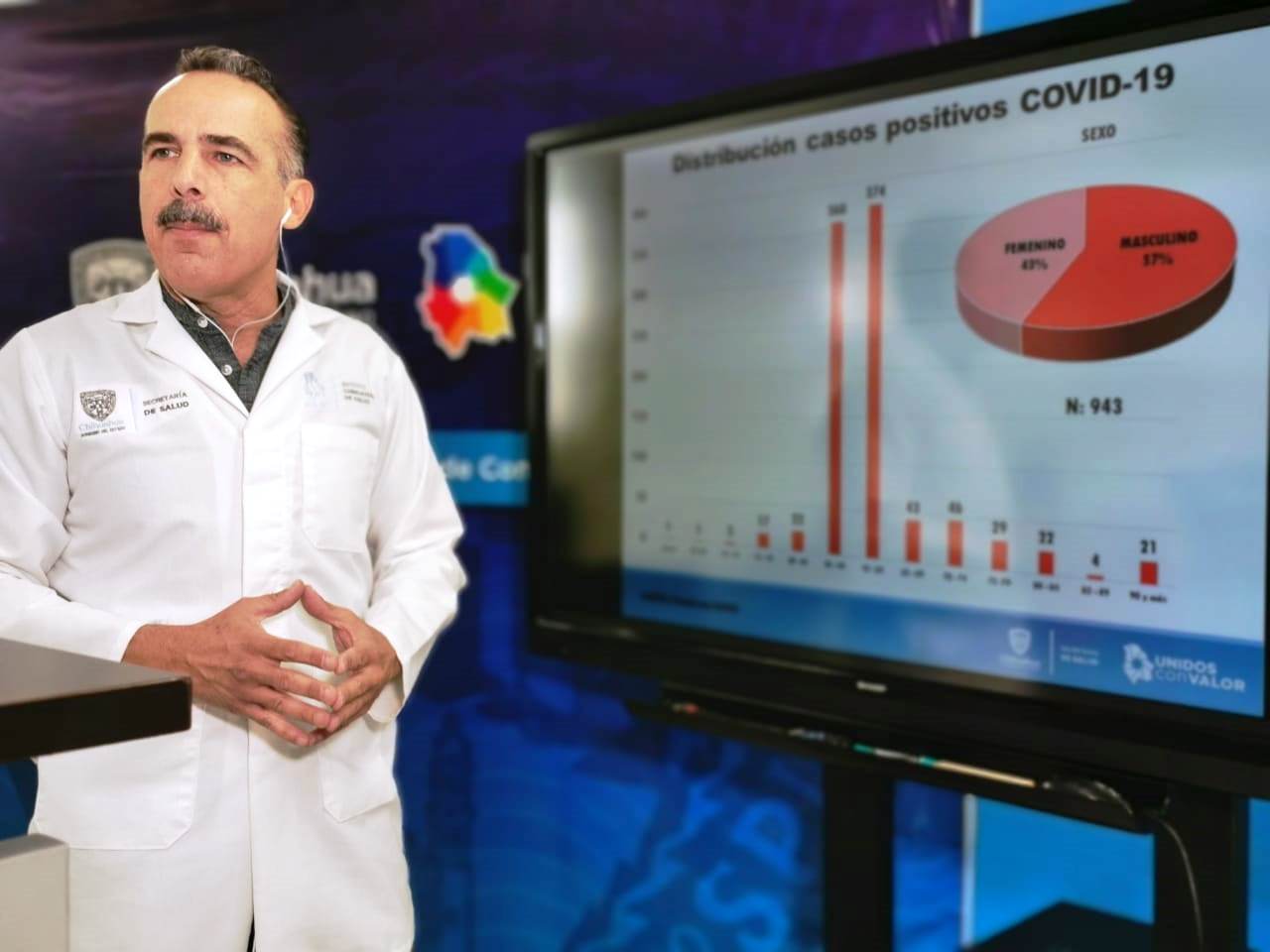 El director médico de la Secretaría de Salud en la Zona Norte, Arturo José Valenzuela Zorrilla, informó que de los 943 confirmados, 583 pertenecen a Ciudad Juárez, 281 a la ciudad de Chihuahua, 6 a Bachíniva, 10 a Cuauhtémoc, 1 a Ojinaga, 2 a Namiquipa, 3 a Meoqui, 1 a Julimes, 1 a Camargo, 1 a Saucillo, 4 de Ahumada, 2 a Guadalupe, 4 a Guachochi, 10 a Delicias, 1 de Ascensión, 1 a Guerrero, 1 a Bocoyna, 1 a Madera, 12 a Parral, 2 a Buenaventura, 1 a Temósachi, 1 a Galeana, 1 a Guadalupe y Calvo, 5 a Nuevo Casas Grandes, 2 a Rosales, 3 a Jiménez, 1 de Aldama, 1 a Santa Bárbara y 1 a Ignacio Zaragoza. El 57% son del sexo masculino y 43% del femenino.