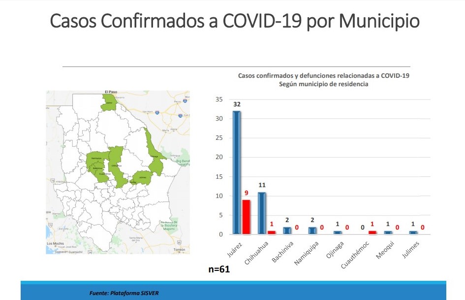 Chihuahua, Chih. – Las autoridades de la Secretaría de Salud informaron que al 9 de abril de 2020, se tienen en el estado de Chihuahua un total de 61 casos confirmados de COVID-19, de los cuales 41 pertenecen a Ciudad Juárez, 12 a la capital, dos a Bachíniva, uno a Cuauhtémoc, uno en Ojinaga, dos en Namiquipa, uno a Meoqui y se agrega Julimes con uno.