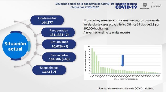 La cantidad de casos confirmados con este padecimiento ascendió a 144 mil 277 (+4) y estos casos nuevos se registran en los municipios de Juárez (+1), Chihuahua (+2) y Aldama (+1).