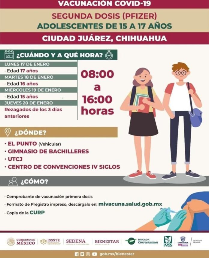 Ciudad Juárez, Chih. (ADN / Martìn Orquiz) – A través de redes sociales, padres de familia están recibiendo la convocatoria de la Secretaría de Bienestar para que adolescentes de 15 a 17 años acudan a que les sea administrada la segunda dosis de la vacuna Pfizer BioNTech del lunes 17 de enero al jueves 20 del mismo mes.
