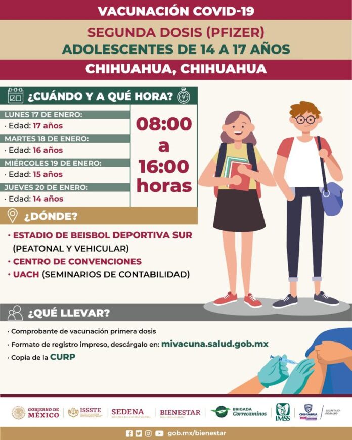 Además, informa personal de la Secretaría de Bienestar, se cita la próxima semana a segunda dosis de Pfizer BioNTech para adolescentes de 14 años de la Ciudad de Chihuahua.