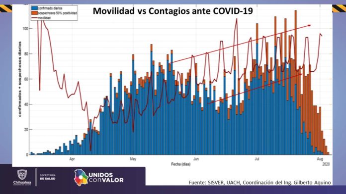 Chihuahua, Chih. – El aumento en la movilidad de las personas a partir del pasado 15 de mayo, con la activación del color naranja en el semáforo epidemiológico, generó un aumento en el número de casos positivos de COVID-19, manifestó Leticia Ruiz González, subdirectora de Prevención y Promoción de la Salud.