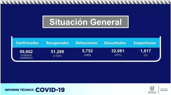 Chihuahua, Chih.- En el último reporte epidemiológico COVID-19, la Secretaría de Salud confirmó un total general de 59 mil 602 casos positivos, con 277 nuevos registros, así como un acumulado de 5 mil 752 defunciones, con 22 personas más fallecidas en la entidad.