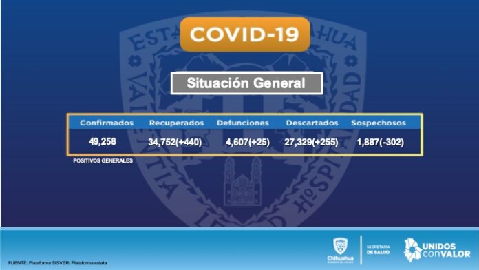 Chihuahua, Chih. – Las defunciones ocasionadas por la pandemia de COVID-19 en el estado de Chihuahua, suman ya 4 mil 607 casos y los contagiados ascienden a 49 mil 258, informó la Secretaría de Salud estatal.
