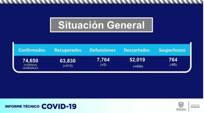 Chihuahua, Chih .- La Secretaría de Salud informó que se registraron 65 nuevos contagios y dos decesos por COVID-19 en el estado, con lo que el acumulado total es de 74 mil 650 casos y 7 mil 764 defunciones.