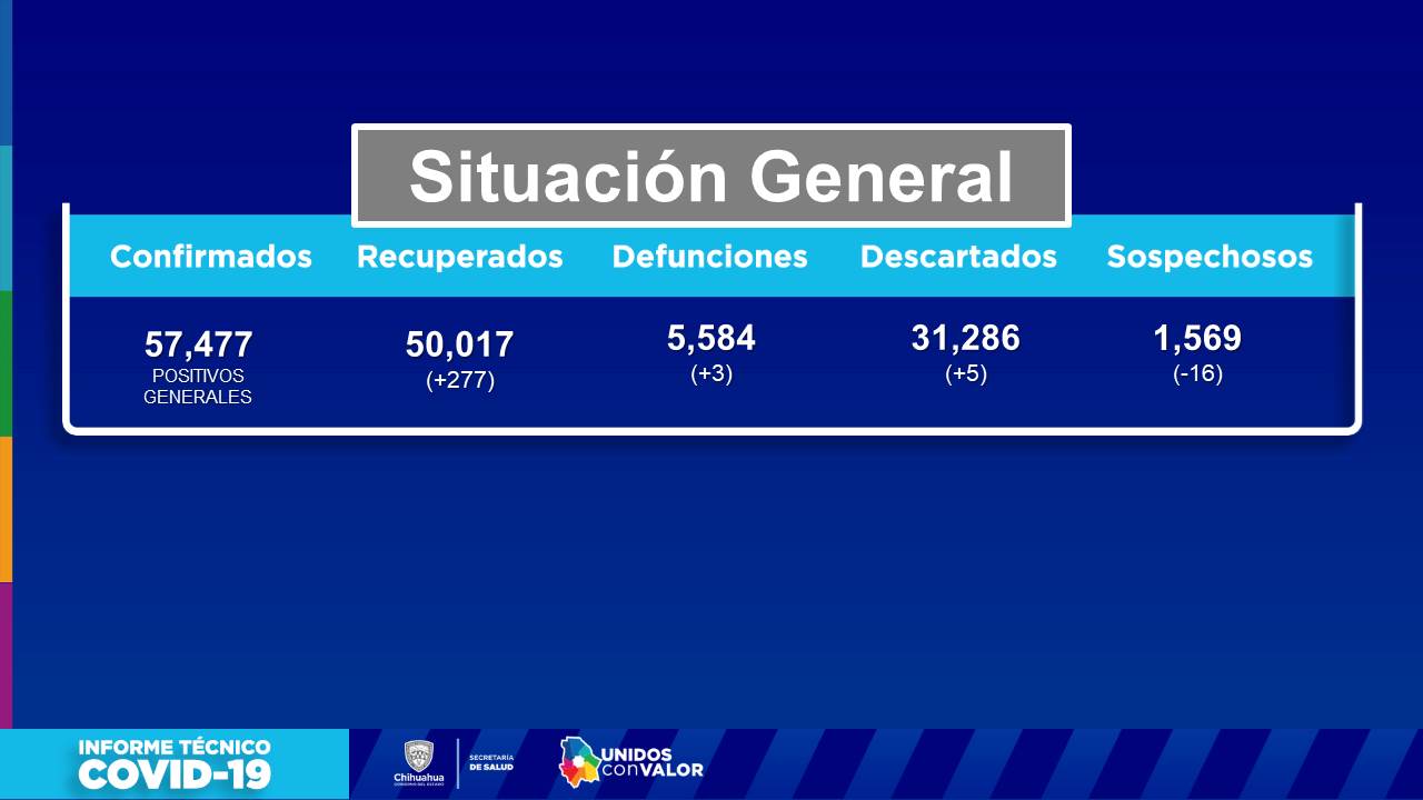 En cuanto a fallecimientos confirmó tres muertes causadas por el virus SARS-CoV-2 en Chihuahua (2) y Delicias (1), por lo que la cifra total pasó a 5 mil 584 decesos.