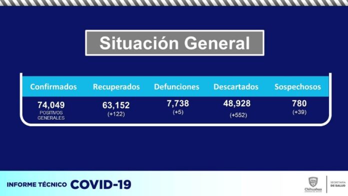 Chihuahua, Chih .- A 17 meses de la pandemia por coronavirus en el estado de Chihuahua van 74 mil 049 contagios acumulados y 7 mil 738 defunciones, de acuerdo al último reporte epidemiológico de la Secretaría de Salud estatal.