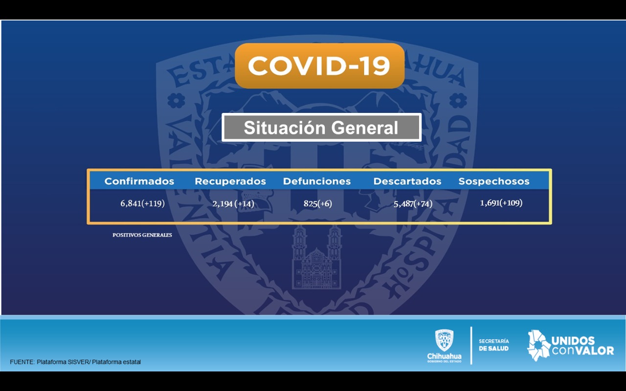 El informe técnico de la Secretaría de Salud Chihuahua sobre la situación de la pandemia dio a conocer este día que en el estado hay un total de 6 mil 841 casos confirmados de COVID-19, luego de sumar otros 119 positivos.
