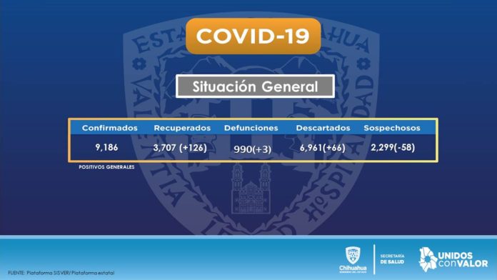 Chihuahua, Chih. – El total de decesos es de 990. La Secretaría de Salud informó que en el estado de Chihuahua se tiene un total de 9 mil 186 casos confirmados de COVID-19 con 158 nuevos, así como tres defunciones más para sumar 990.