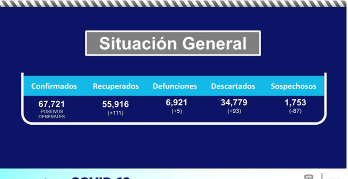 Además van 55 mil 916 (+111) pacientes recuperados, 34 mil 779 (+93) descartados y mil 753 (-87) sospechosos.