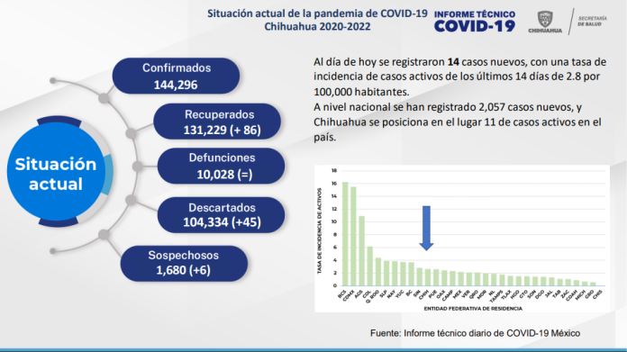 A nivel nacional se registraron 2 mil 057 casos nuevos. El estado de Chihuahua se posiciona en el lugar 11 de casos activos en el país, lo que presenta una tasa de incidencia de los últimos 14 días, de 2.8 casos activos por cada 100 mil habitantes.
