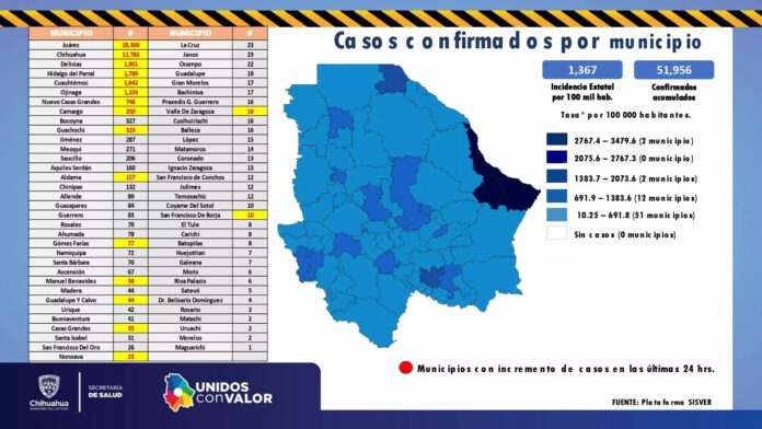 En ese mismo lapso la institución reportó 15 decesos a causa de la enfermedad y la suma total llegó a 4 mil 818 víctimas; 5 de los fallecimientos ocurrieron en Ciudad Juárez; 4 en Chihuahua y 1 en cada uno de los municipios de Cuauhtémoc, Parral, Nuevo Casas Grandes, Guerrero, Ojinaga y Guadalupe y Calvo.