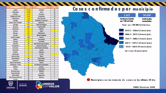 Ciudad Juárez, Chih. – Un total general de 50 mil 629 son los casos confirmados de COVID-19 que se registran en la entidad, informó la Secretaría de Salud, a través de la rueda de prensa que diariamente se transmite para actualizar la información de la pandemia.