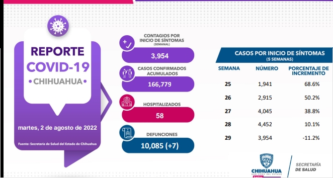 El Gobierno del Estado, a través de la Secretaría de Salud de Chihuahua, presenta este 2 de agosto el reporte COVID-19, que registra un acumulado de 166 mil 779 (+2 mil 524) casos confirmados; 3 mil 954 por inicio de síntomas y 58 pacientes hospitalizados.