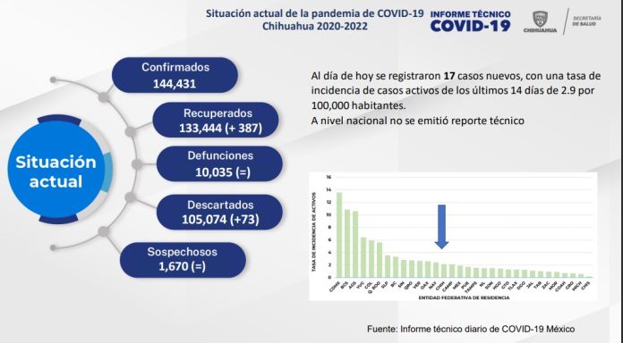 La cantidad de casos confirmados con este padecimiento ascendió a 144 mil 431 (+17) y estos casos nuevos se registran en los municipios de Juárez (+2), Chihuahua (+11), Cuauhtémoc (+3) y Guazapares (+1).