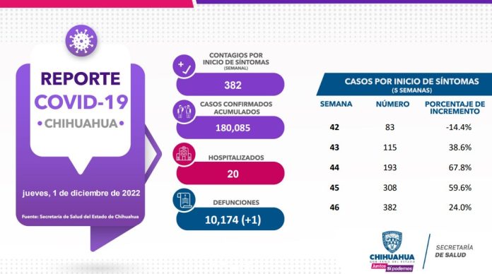 El Gobierno del Estado, a través de la Secretaría de Salud de Chihuahua, presenta este 1 de diciembre el reporte COVID-19, que registra un acumulado de 180 mil 085 (+313) casos confirmados, 382 casos por inicio de síntomas y 20 pacientes hospitalizados.