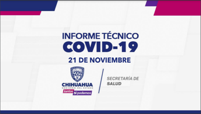 El Gobierno del Estado, a través de la Secretaría de Salud de Chihuahua, presenta este 21 de noviembre el reporte COVID- 19, en el cual se registran 84 mil 444 (+229) personas confirmadas en la entidad por este padecimiento, 72 mil 203 (+75) casos recuperados, 79 mil 274 (+318) descartados y 957 (+21) casos sospechosos.