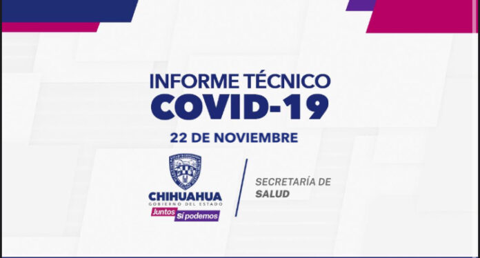 El Gobierno del Estado, a través de la Secretaría de Salud de Chihuahua, presenta este 22 de noviembre el reporte COVID-19, en el cual se registran 84 mil 471 (+27) personas confirmadas en la entidad por este padecimiento, 72 mil 259 (+56) casos recuperados, 79 mil 292 (+18) descartados y 946 (-11) casos sospechosos.