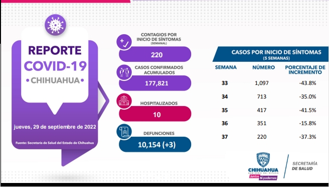 El Gobierno del Estado, a través de la Secretaría de Salud de Chihuahua, presenta este 29 de septiembre el reporte COVID-19, en el cual se registra un acumulado de 177 mil 821 (+99) casos confirmados, 220 casos por inicio de síntomas y 10 pacientes hospitalizados.