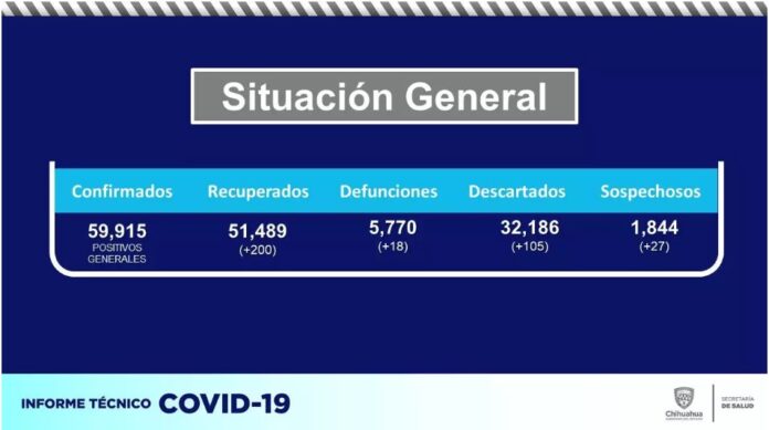 El total de fallecimientos es de 5 mil 770 con 18 nuevos confirmados en el estado: 3 en Juárez, 6 en la capital, 2 en Cuauhtémoc, 1 en Namiquipa, 1 en Camargo, 2 en Nuevo Casas Grandes, 1 en Guerrero, 1 en Ojinaga y 1 en Rosales.