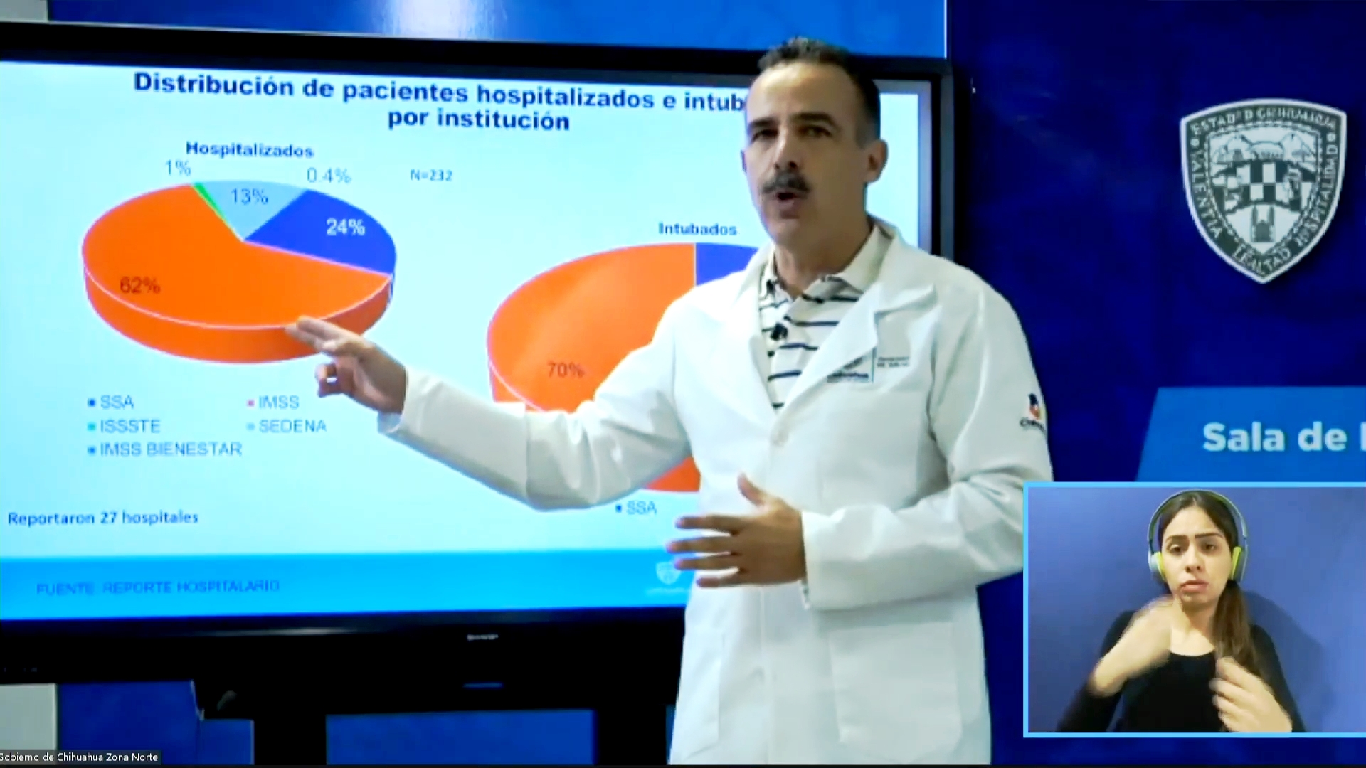 De las personas contagiadas, 232 están hospitalizadas. El 62% son derechohabientes del IMSS, 24% del Sector Salud (SS), 13% de Sedena, 1% del Issste, 0.4% de IMSS Bienestar.