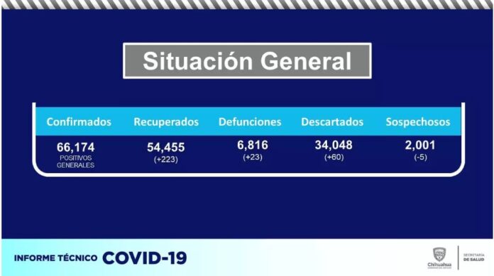 Chihuahua, Chih.- Con 23 registros más en comparación con el reporte anterior, el estado de Chihuahua llegó a 6 mil 816 personas fallecidas a causa de la pandemia de COVID-19, informó la Secretaría de Salud.