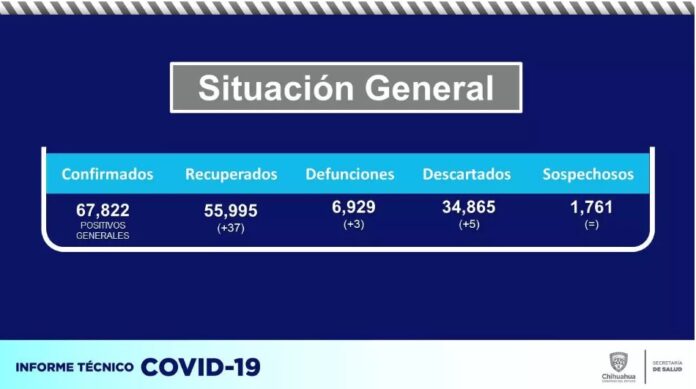 El informe muestra que en las últimas horas se confirmaron 24 nuevos contagios y tres fallecimientos más en Chihuahua; los municipios con más casos acumulados son Juárez con 31 mil 606; Chihuahua con 19 mil 836, Parral con 2 mil 885, Cuauhtémoc con 2,593 y Delicias con 2 mil 438.