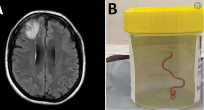 El gusano rojo, de 8 centímetros de largo, estaba vivo y retorciéndose cuando lo extrajeron del cerebro de la paciente. Los científicos creen que podría haber estado allí desde dos meses antes de ser extraído.