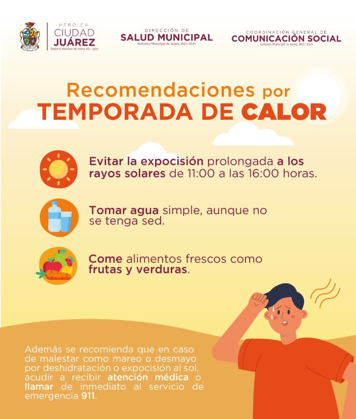 Ciudad Juárez, Chih .- La directora de Salud, Daphne Santana Fernández, comentó que los golpes de calor son una condición médica grave que puede poner en riesgo la vida; ocurren cuando el cuerpo se sobrecalienta debido a una exposición prolongada a altas temperaturas y la incapacidad de regular la temperatura interna.
